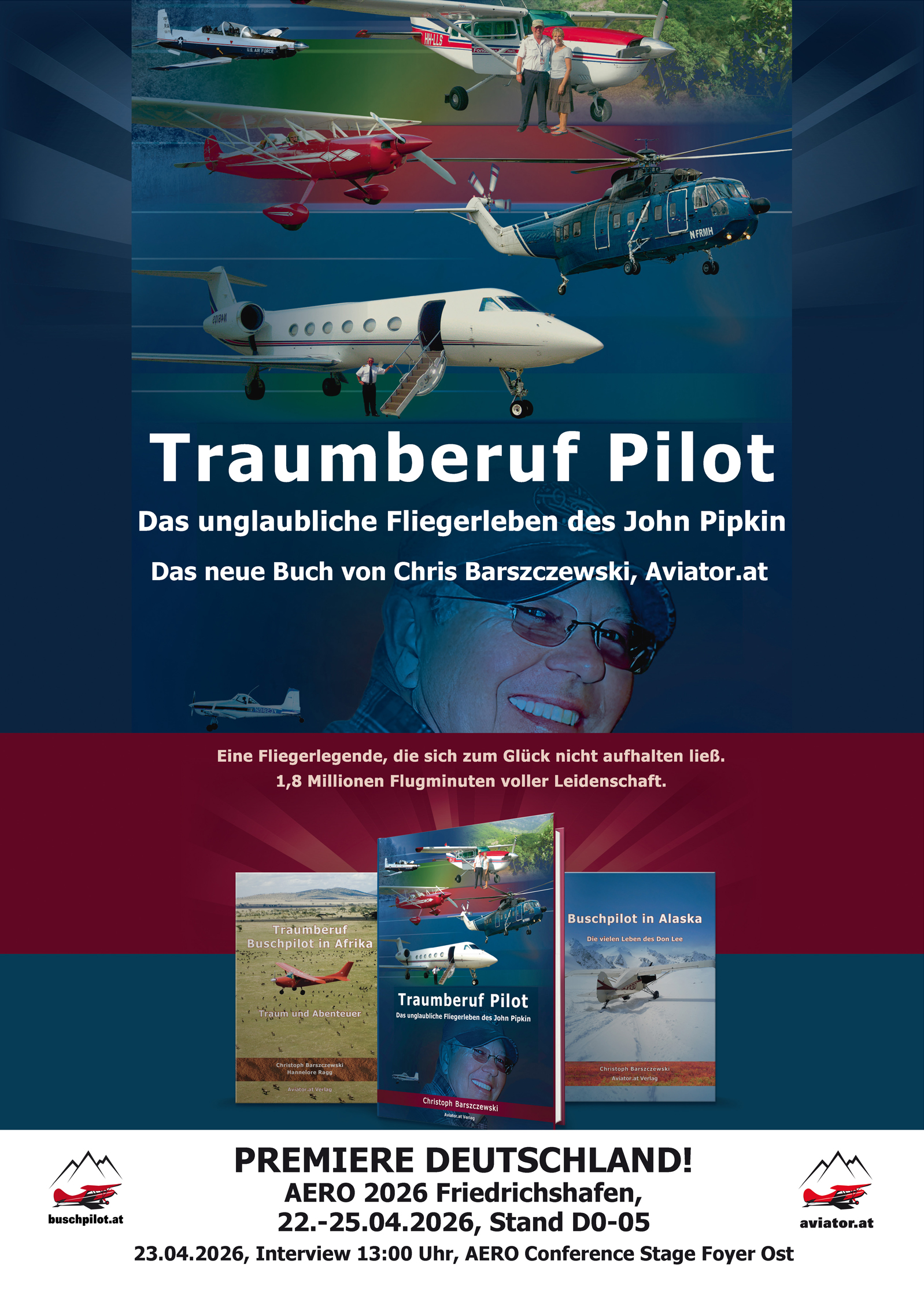 Die Premiere des Buches "Traumberuf Pilot" in Deutschland findet am 22.-25.04.2026 auf der Messe AERO 2026 in Friedrichshafen statt. Besuchen Sie den Autor, Pilot und Wasserfluglehrer Chris Barszczewski und seinen Gast John Pipkin, den Ausnahmepilot und Hauptdarsteller des Buches, auf ihrem gemeinsamen Stand Nr D0-05.