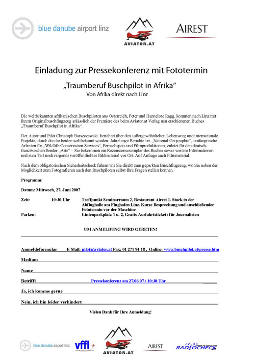 | Event - Flughafen Linz 27.06.2007 Buchprämiere mit dem Autor und dem Buschpiloten Einladung samt Programm und Anmeldung zur Pressekonferenz (pdf) Einladung und Info zu der Abendveranstaltung für die Öffentlichkeit pdf) Plakat A3 (pdf) |